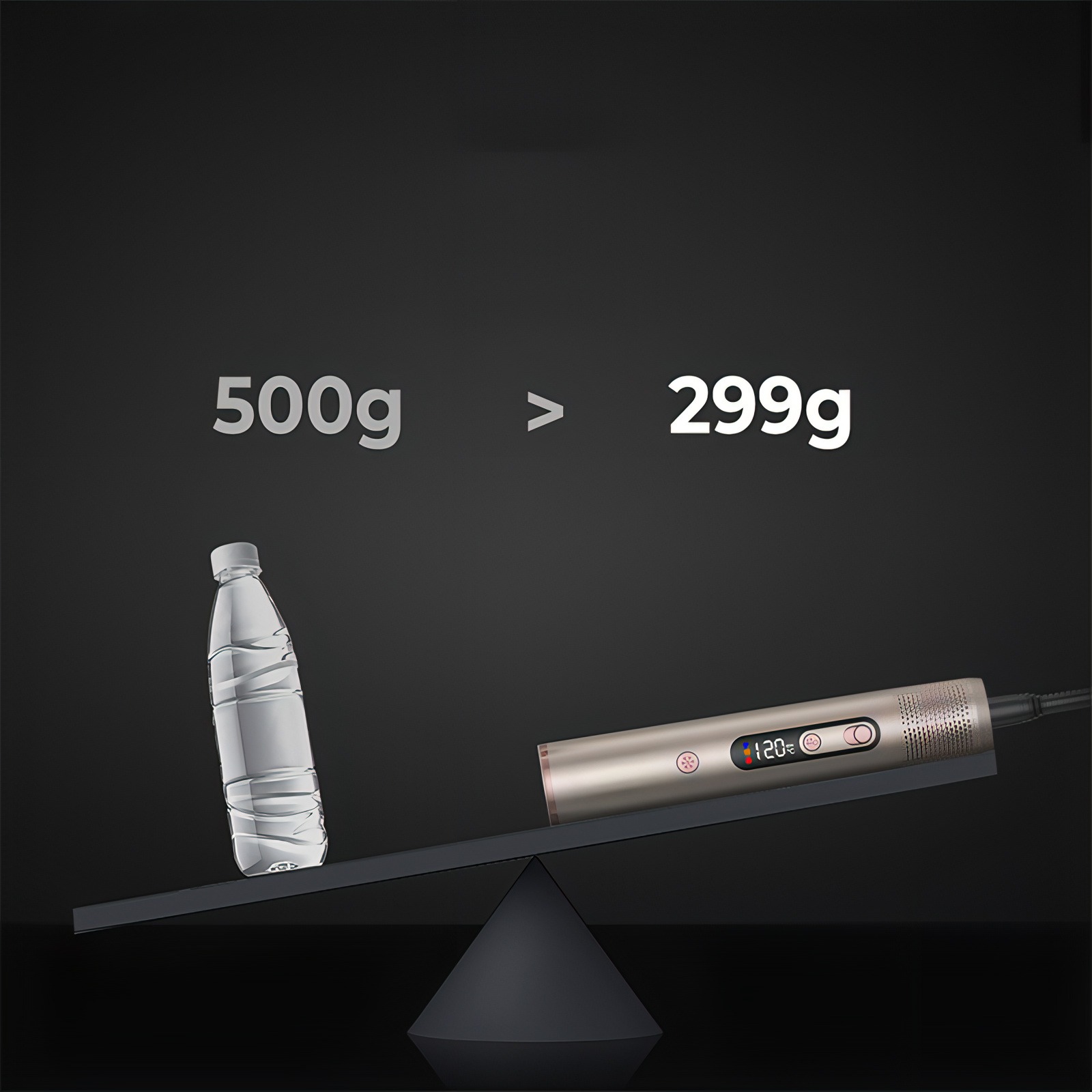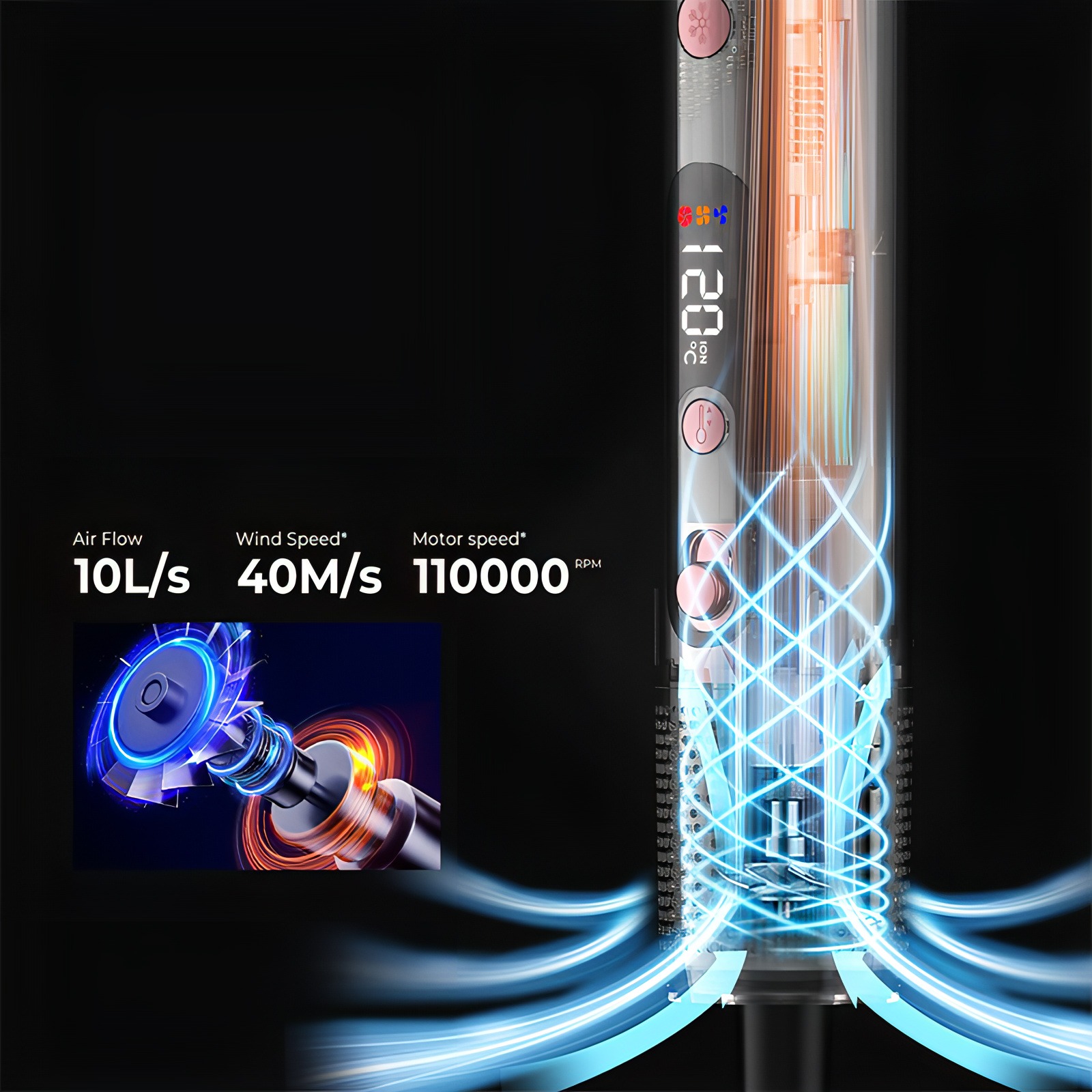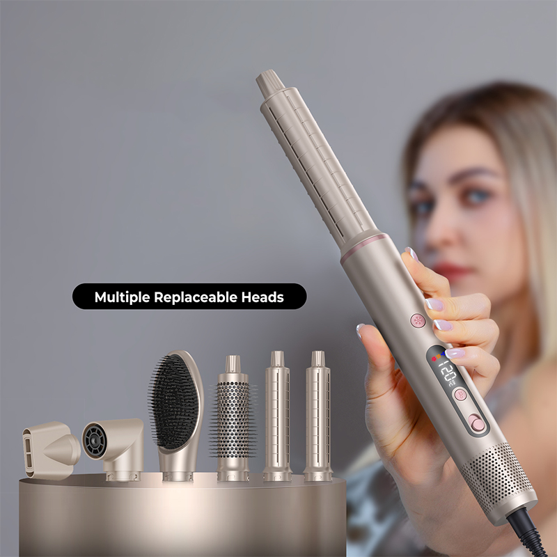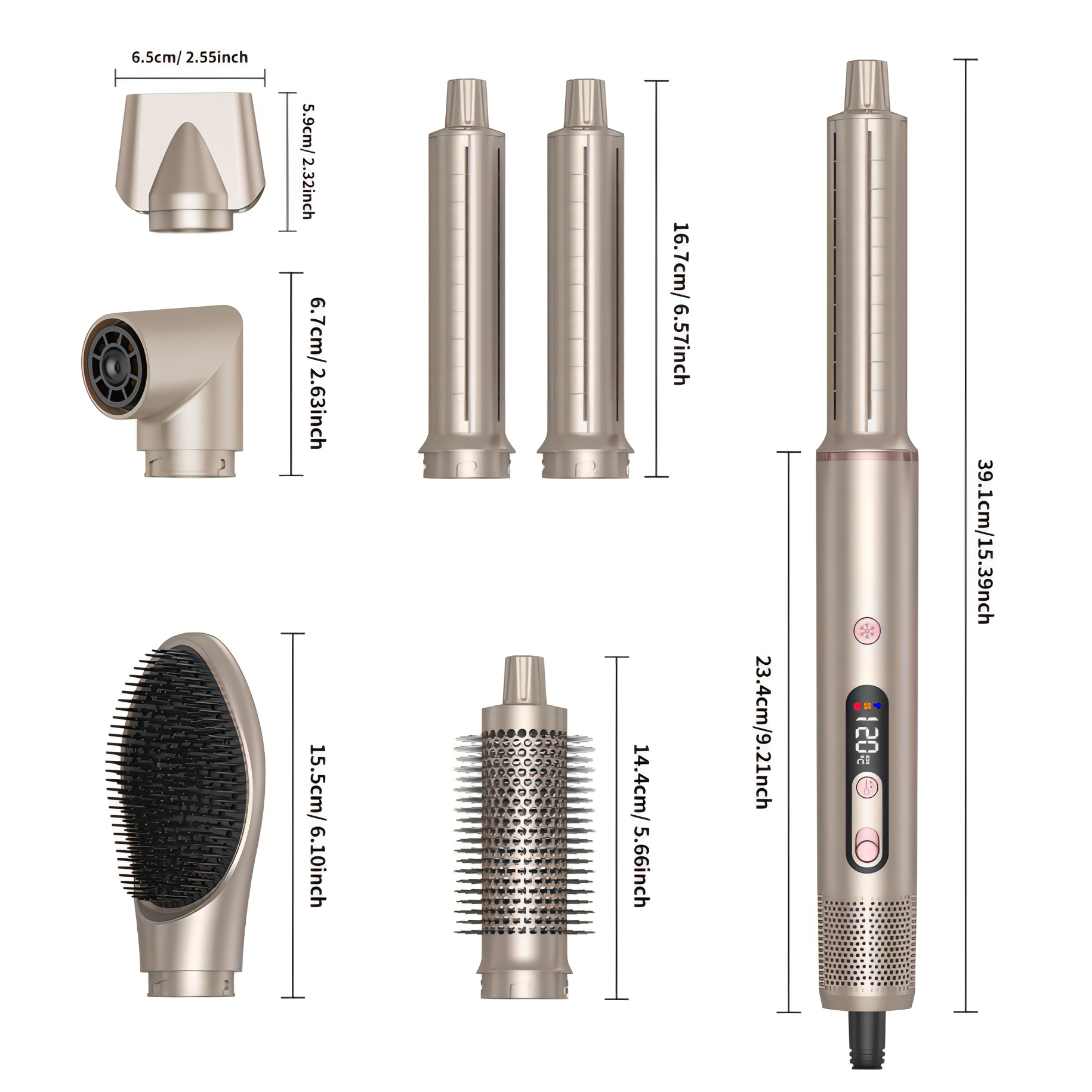 Include spazzola ad aria calda, cilindri arricciacapelli sinistro e destro, beccucci per asciugare e concentrare, e testina lisciante. La spazzola asciuga in fretta creando ricci naturali; i cilindri formano onde morbide; i beccucci dirigono l’aria per asciugare più veloce; la testina liscia i capelli. Stile completo e pratico in un solo strumento.